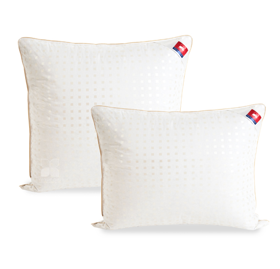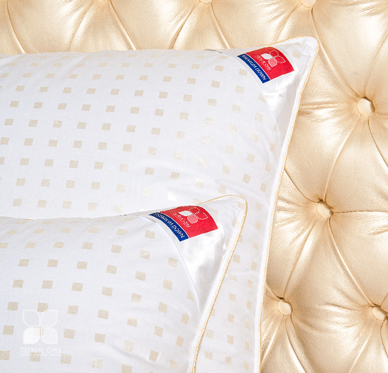 Для самых требовательных потребителей подушка в традиционном исполнении из белоснежного пуходержащего тика с мелким рисунком шашечки и шелковым кантом цвета шампань по периметру, изящно подчеркивающим форму.