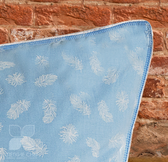 Наполнитель подушки из гусиного пуха с добавлением гусиного перышка 2 категории. Пух придает подушке мягкость и легкость, а перо добавляет объем и плотность. Подушка выполнена из пуходержащего хлопкового тика голубого цвета с рисунком в виде пёрышка, по краю подушки отделка белым кантом, фирменная упаковка конверт ПВД, спанбонд.